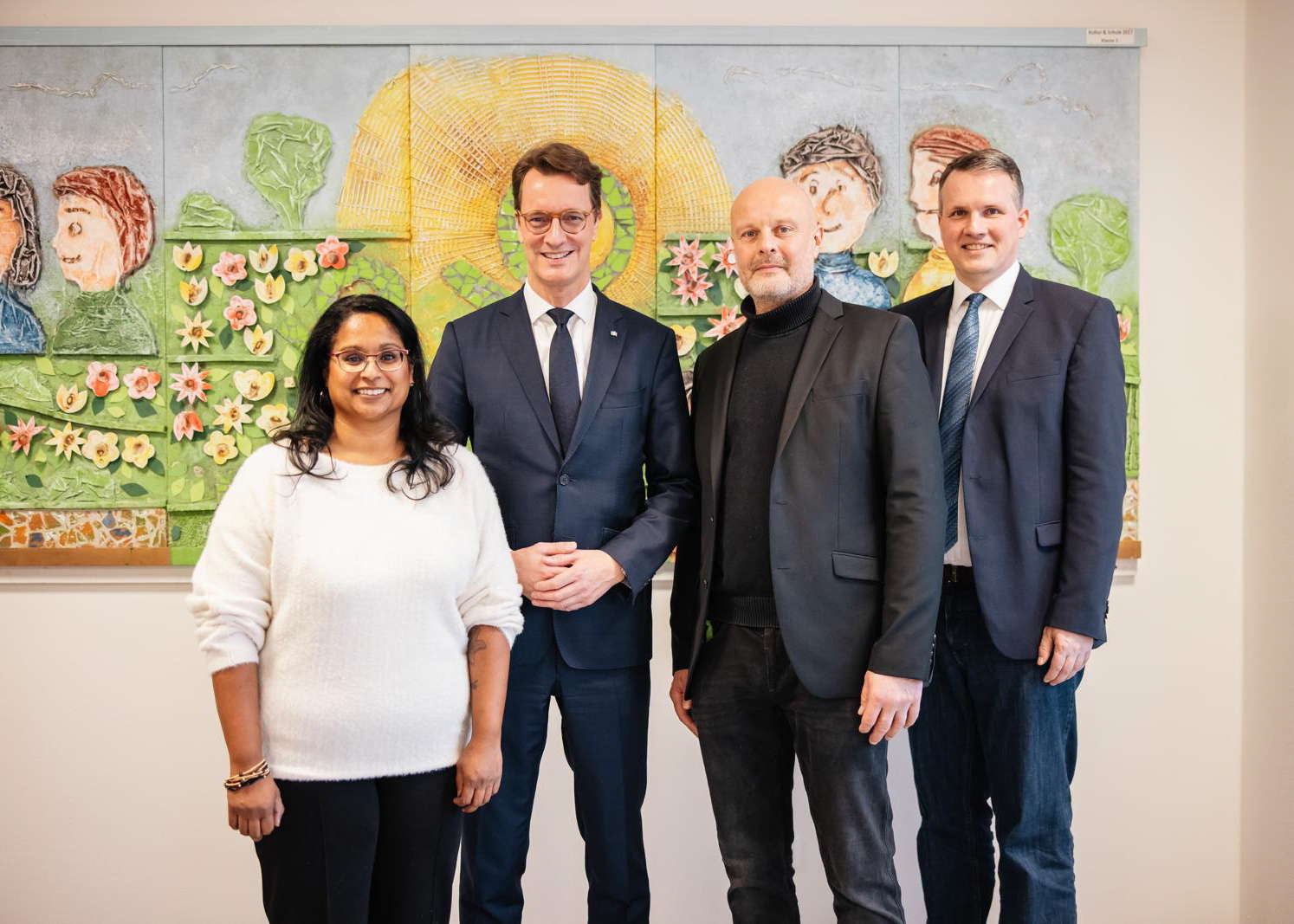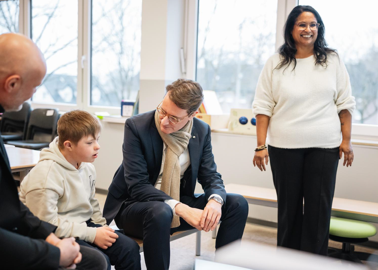 Dann geht es plötzlich ganz schnell und Vincent ist bereit und dekoriert mit seiner Kinderbürgermeister Medaille: Die Gäste aus dem Schwimmbad kommen nach oben und Vincent begrüßt sie alle freundlich und charmant – ganz Profi eben. Unter ihnen sind der Ministerpräsident von NRW, Herr Wüst, Presseleute vom WDR und ein Fotograf.