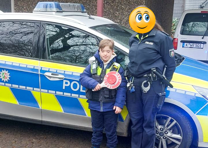 Während der Bürgermeister und die Schulleitung noch auf die Gäste warten, bekommt Vincent schon mal ein echtes Highlight geboten: Katjas Polizeiauto. Gucken, staunen, bewundern, anfassen und ausprobieren. Das Blaulicht funktioniert!