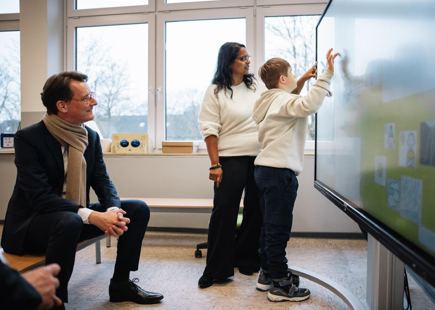 Beim Rundgang durch die Schule gehen noch viele andere Leute mit. Erste Station: der Klassenraum der Super-Mario-Klasse. Das ist selbstverständlich Vincents Klasse. Frau Winkels erklärt den Stundenplan am Smartboard, und dann kommt die alles entscheidende Frage: „Was ist dein Lieblingsfach?“ Vincent zögert keine Sekunde: „Die Pause.“ Logisch! Was für eine Frage. Die Erwachsenen lachen – Vincent nickt wissend.
